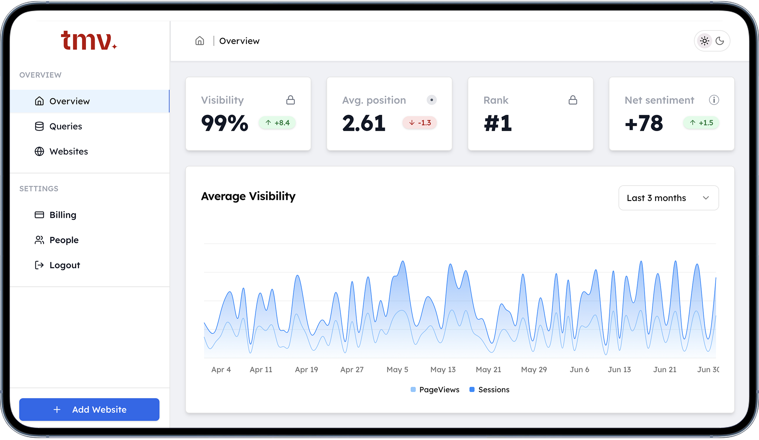 Track, analyze, and improve brand performance on AI search platforms through key metrics like Visibility, Position, and Sentiment with our comprehensive AI visibility tracker.